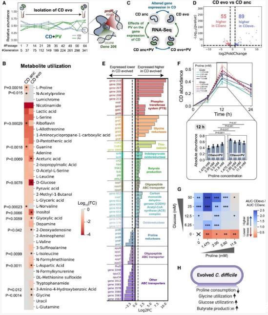 圖3|艱難梭菌獲得了長期與PV共培養過程中,改變其代謝生態位的進化