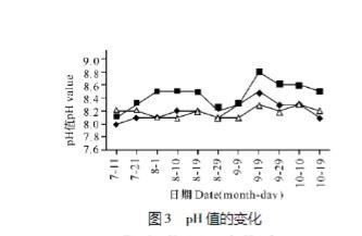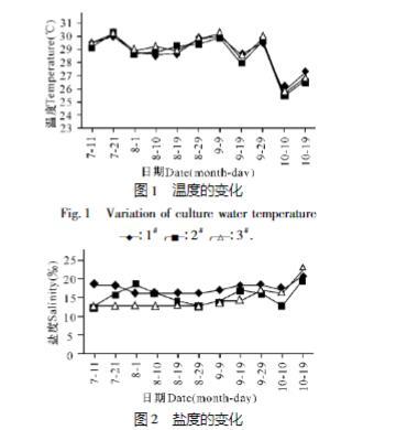 從投蝦苗至收蝦,3口池塘的水溫、鹽度、pH值變化皆比較平緩,變化相似。由于正值高溫時節(jié),水溫基本維持在28~30°C之間,10月份稍降至25°C左右。鹽度為14.15%~23.55%,養(yǎng)殖前期[7月11日~8月10日]與后期[9月29日~10月19日)皆大于16.8%,中期[8月19日~9月19日]降至14%左右,這是受臺風和暴雨短暫影響所致。pH值皆大于8.0,多為8.1~8.8。