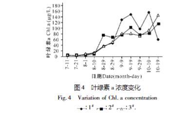 3口池塘的葉綠素a的濃度養(yǎng)殖前期低,中后期高。在養(yǎng)殖開始的1個月內,葉綠素a的濃度在10.0μg/L以下,中期迅速增長,后期達到150.0μg/L左右,但是3口池塘的變化情況并不完全相同。1號池塘的最高值是10月10日的157.7μg/L,次高值是9月19日的148.8μg/L,后期濃度高而且變化幅度大,至收蝦時降至59.3μg/L;2號池塘的次高值是9月19日的103.5μg/L,其后降低,又逐漸升高,至收蝦時達到最高值116.2μg/L;3號池塘的葉綠素a濃度則是隨著養(yǎng)殖時間的推移而逐步升高,至收蝦時達到最高值143.5μg/L,次高值是10月10日的91.4μg/L。