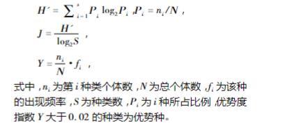 式中,n_i為第i種類個體數,N為總個體數,f_i為該種的出現頻率,S為種類數,P_i為i種所占比例,優(yōu)勢度指數Y大于0.02的種類為優(yōu)勢種。