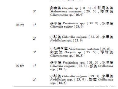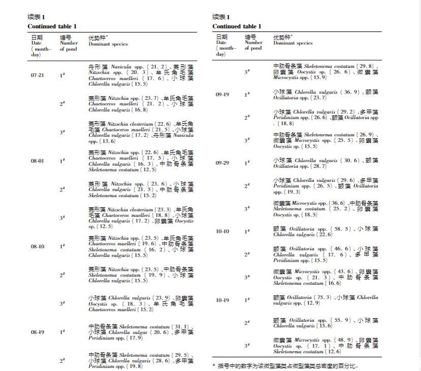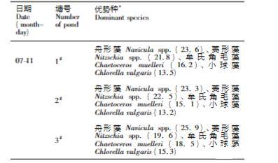 3口池塘的微藻種類組成,養(yǎng)殖前期種類較多,主要是硅藻和綠藻,優(yōu)勢(shì)種有硅藻門的菱形藻[Nitzschia spp.]、舟形藻[Navicula spp.]、中肋骨條藻[Skeletonema costatum]和綠藻門的小球藻[Chlorella sp.]、卵囊藻[Oocystis sp.]等;養(yǎng)殖中后期種類減少,優(yōu)勢(shì)種也發(fā)生了變化,主要是綠藻、藍(lán)藻和甲藻,3口池塘的微藻種類組成略有不同。1號(hào)池塘中后期的優(yōu)勢(shì)種有綠藻門的小球藻、藍(lán)藻門的顫藻[Ocillatoria spp.],2號(hào)池塘的優(yōu)勢(shì)種為綠藻門的小球藻、藍(lán)藻門的顫藻和甲藻門的多甲藻[Peridinium spp.],3號(hào)池塘的優(yōu)勢(shì)種為綠藻門的卵囊藻[Oocystis sp.]、硅藻門的中肋骨條藻和藍(lán)藻門的微囊藻[Microcystis spp.]。