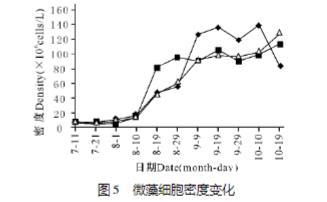 3口池塘的微藻細(xì)胞密度也是養(yǎng)殖前期低,中后期高。在養(yǎng)殖前期,3口池塘的微藻細(xì)胞密度變化不大,皆在20×10^6 cells/L以下,從8月中旬開始,微藻細(xì)胞密度呈現(xiàn)快速增長(zhǎng)的態(tài)勢(shì)。1號(hào)池塘8月19日的微藻細(xì)胞密度[46.8×10^6 cells/L]是8月9日的[16.2×10^6 cells/L]近3倍,9月9日的微藻細(xì)胞密度[126.6×10^6 cells/L]是8月29日的[55.3×10^6 cells/L]2倍多,其后維持在100.0×10^6 cells/L的高值但變化劇烈,到10月10日達(dá)最高值139.6×10^6 cells/L,而10月19日則降至83.6×10^6 cells/L;2號(hào)池塘8月19日的微藻細(xì)胞密度比8月9日的猛增了7倍,達(dá)到89.5×10^6 cells/L,然后波動(dòng)式增長(zhǎng),到10月19日達(dá)最高值113.6×10^6 cells/L;3號(hào)池塘8月19日的微藻細(xì)胞密度[45.2×10^6 cells/L]比8月9日的[12.6×10^6 cells/L]增長(zhǎng)了3倍,到收蝦時(shí)藻細(xì)胞密度為最高值127.5×10^6 cells/L。