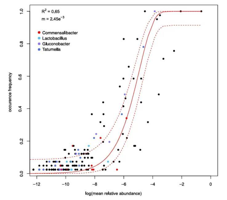 此外,Commensalibacter的不同ASV在中性模型中出現(xiàn)了三種模式:有些高于預(yù)期(說明受到宿主選擇),有些與模型預(yù)測一致,還有少數(shù)低于預(yù)期(可能受到排斥)。這表明即使在同一屬中,不同菌株可能也具備不同的定殖策略。