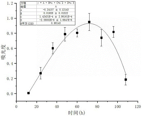 ⑹生長曲線繪制:每個時間段樣品的吸光度設置三個平行,使用AVERAGE函數求平均值,使用STDEVP函數計算標準誤差;然后以測定時間為X軸,以490nm處的吸光值為Y軸,繪制散點圖,對散點圖進行非線性擬合,繪制生長曲線并得到擬合方程。