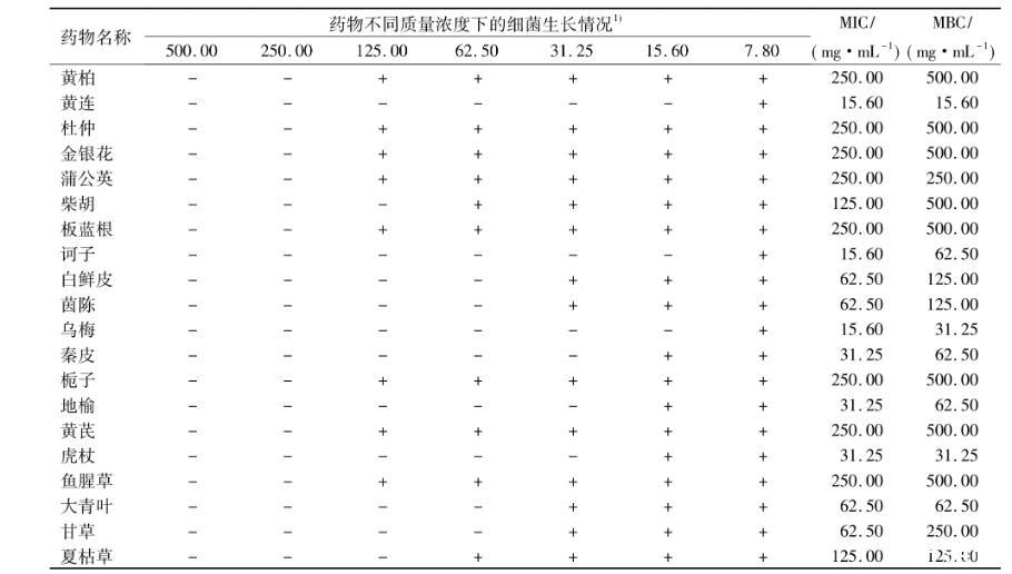 各味中藥藥敏試驗(yàn)判定標(biāo)準(zhǔn):參考劉忠義等介紹的判斷標(biāo)準(zhǔn),MIC<7.80 mg/mL,為高度敏感;7.80 mg/mL<MIC<250.00 mg/mL,為中度敏感;MIC>250.00 mg/mL,為不敏感.