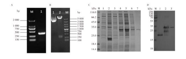 圖1 Microplusin-like基因擴增、雙酶切和重組蛋白的表達結果注:A.Microplusin-like基因擴增,M.DL2000 marker,1.Microplusin-like PCR產物;B.雙酶切結果,M.DL5000 marker,1.pCold-SUMO;2.pCold-SUMO/Microplusin-like;C.SDS-PAGE結果,M.14.4~116 kDa protein marker,1.pCold-SUMO空載未誘導,2.pCold-SUMO空載誘導,3.重組載體未誘導,4.重組載體誘導,5.重組載體表達沉淀,6.重組載體表達上清,7.純化后的重組蛋白;D.Western Blot結果,M.10~250 kDa蛋白marker,1.空載體誘導,2.重組載體誘導,3.純化后的重組蛋白。