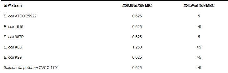對各供試菌株的MIC及MBC結果表明,重組蛋白對大腸埃希菌及沙門菌具有較高的抑菌活性,除E.coli K88外,最小抑菌濃度均在0.625 mg/mL,但其殺菌活性相對較弱,部分菌株的MBC值超過5 mg/mL,達到了MIC的8倍(表2)。