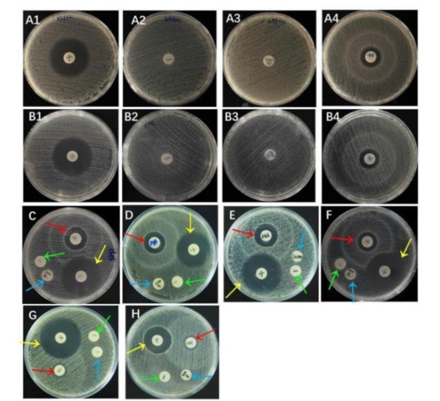 圖2 Microplusin-like的抑菌圈試驗結果注:A1~A4依次為:E.coli ATCC 25922陽性對照、陰性對照、空白對照、Microplusin-like;B1~B4依次為Salmonella pullorum CVCC 1791陽性對照、陰性對照、空白對照、Microplusin-like;C.E.coli 1515;D.E.coli 987P;E.E.coli K88;F.E.coli K99;G.S.aureus CVCC 1882;H.S.aureus ATCC4 3300;C~H.紅色箭頭為Microplusin-like,綠色箭頭為陰性對照,藍色箭頭為空白對照,黃色箭頭為陽性對照。