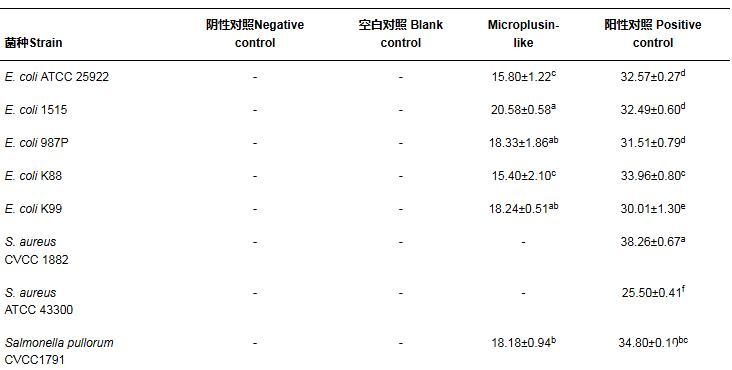 表1 Microplusin-like的抑菌圈直徑mm