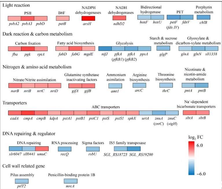 與以上光反應相關基因的差異化表達趨勢類似,在高光條件下,相比野生型6803,高光6803中與光合固碳、能量-物質代謝、跨膜轉運相關基因的表達水平也有顯著變化。如cmpA、cmpB編碼ATP依賴的碳酸氫鹽轉運蛋白復合物組分,cmpA與cmpB的表達分別上調了24.3倍與10.5倍。此外,編碼卡爾文循環中核糖5-磷酸異構酶的rpiA表達上調了6.0倍,編碼磷酸甘油酸激酶的pgk、編碼果糖-1,6-二磷酸醛縮酶的fba表達分別上調21.5倍與7.0倍。因此,我們推測高光6803耐高光、生長快、生物量積累多也得益于碳酸氫鹽轉運蛋白復合物、固碳反應相關基因的表達上調。