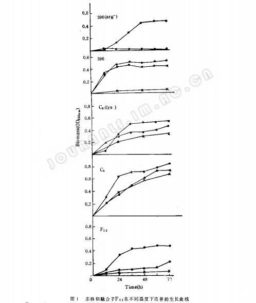1.在不同溫度條件下親株和融合子的生長曲線:出發親株、直接親株和融合子在YPD液體培養中靜止培養在28℃、42℃和45℃,72h的生長曲線(圖1)表明營養缺陷型菌株的耐熱性比出發菌株顯著下降,而回到原養型的融合子耐熱性雖然各株不一,但也都比原出發親株略差。