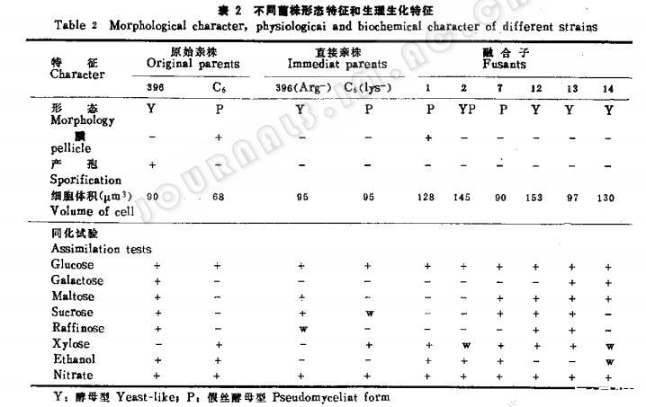 隨機挑出6株融合子進行考核。從其從表2和表3可以看出融合子的培養特征形態,大小、每個細胞的DNA含量和生理生化特征表現不一,特別是糖類同化更是多樣,其細胞體積平均為親株的1.3倍,DNA含量平均為親株的1.6倍。
