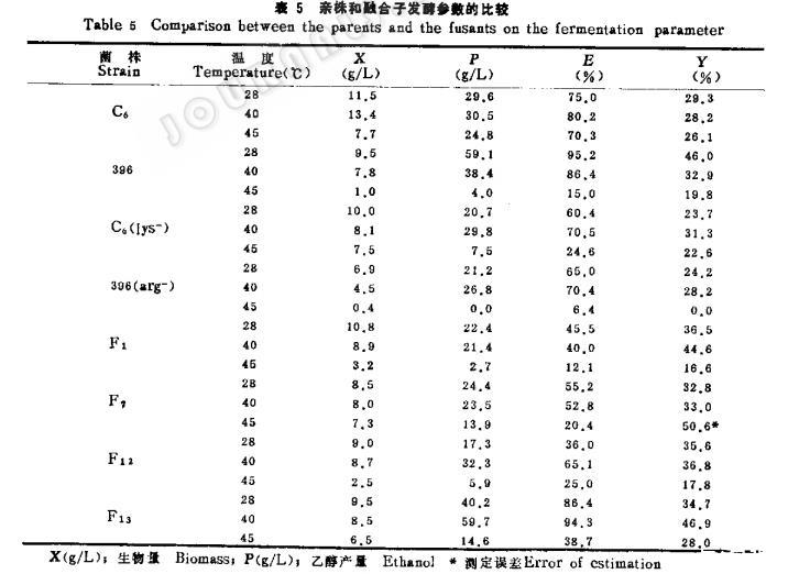 2.不同溫度條件下基質消耗和乙醇產量的比較:各類型菌株在28℃、40℃和45℃培養條件下,利用甘蔗糖蜜發酵乙醇的各種參數(表5)表明,營養缺陷型菌株396(arg-)在不同溫度下,乙醇的產率和基質的利用都比原出發親株:396低,經過與耐熱菌株C。(1s-)融合后得到的融合子,只有F13一株乙醇產率和基質利用率比較理想。在40℃和45℃下培養,乙醇產量均高于原生產菌株396。