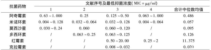 3.3沙眼衣原體(Ct)藥敏檢測由于采用McCoy細胞培養法,其技術要求和實驗條件要求均比較高,因此限制了臨床應用,故藥敏檢測臨床報道的資料較少。本文所綜合的資料顯示:克拉霉素、米諾環素、莫西沙星有較高的體外抗沙眼衣原體活性,多西環素、阿奇霉素、紅霉素抗沙眼衣原體活性降低。最低抑菌濃度(MIC=μg/ml)中位數均值依序為0.020、0.057、0.095、0.126、0.486、11.375。且Ct對紅霉素的敏感性降低幅度更大,存在耐藥菌株,其23sRNA基因C2452A、T2611C兩個位點發生突變導致紅霉素低水平耐藥,L4基因的點突變可能與紅霉菌素耐藥無關。Ct藥敏結果與臨床療效之間明顯相關,在抗沙眼衣原體感染臨床治療中應盡量選用克拉霉素、米諾環素、莫西沙星等有效藥物。不同藥物聯用,抗Ct活性可出現相反的效果。例如阿奇霉素與莫西沙星、多西環素或利福平聯合應用,抗Ct活性顯著提高;而米諾環素與莫西沙星或利福平聯合應用時,彼此之間抗Ct活性降低。