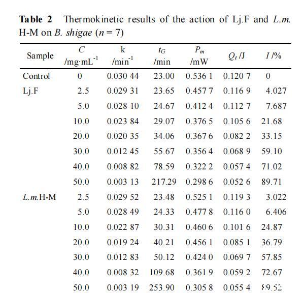 表 2 金銀花和灰氈毛忍冬對志賀痢疾桿菌作用的熱動力學結果 (n=7)