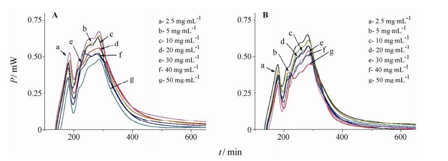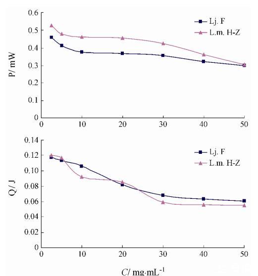 熱動力學參數的特征表明,不同濃度的金銀花和灰氈毛忍冬溶液對志賀痢疾桿菌的生長具有明顯的抑制作用,并且這種抑制活性隨著溶液濃度的增加而增強。自然,生長速率常數 k 和總產熱量 Q_t 逐漸降低,峰值時間被延遲。所有信息如圖 2 所示。