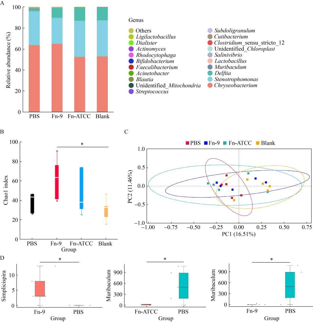 圖4具核梭桿菌對肺部微生物群的影響。A:4組菌屬水平前20個豐度的群落條形圖;B:4組肺泡灌洗液的Chao1指數(P值通過Kruskal-Wallis檢驗計算,*:P<0.05);C:4組肺泡灌洗液的PCoA圖(ANOSIM用于統計評估顯著差異);D:MetagenomeSeq檢測4組之間的差異物種(*:P<0.05)。