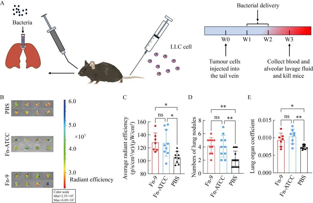 圖2具核梭桿菌促進小鼠肺癌轉移。A:實驗流程圖;B、C:Fn-9、Fn-ATCC和PBS 3組熒光強度比較;D、E:3組肺結節數量和肺器官系數。