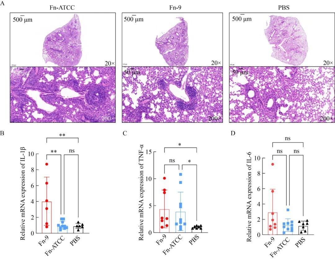 圖3病理切片圖和定量聚合酶鏈反應(qPCR)。A:Fn-9、Fn-ATCC和PBS 3組肺組織切片;B-D:IL-1β、TNF-α和IL-6在小鼠肺組織中的表達(ns:無統計學意義;*: