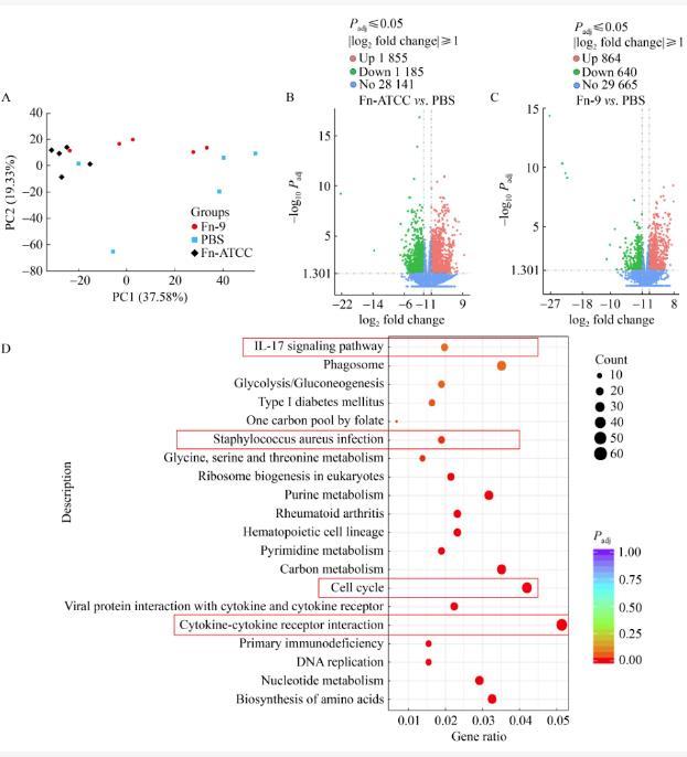 轉錄組測序用于描述肺組織變化的特征。主成分分析(principal components analysis,PCA)結果顯示,Fn-9組、Fn-ATCC組和PBS組的轉錄組基因存在顯著差異(圖5A)。進一步通過火山圖比較其差異基因的變化,發現與PBS組相比,Fn-ATCC組共有1 855個差異基因表達上調,1 185個差異基因表達下調(圖5B);而在Fn-9組與PBS組的比較中,Fn-9組共有864個差異基因表達上調,640個差異基因表達下調(圖5C)。隨后,分析了3組小鼠肺組織中KEGG通路差異基因的富集情況。在Fn-9組、Fn-ATCC組和PBS組的比較中,差異基因主要富集在IL-17信號通路、細胞因子-細胞因子受體相互作用、細胞周期和運動蛋白等信號通路上,這提示Fn-9組和Fn-ATCC組2種菌株可能通過調節免疫反應來促進肺癌的進展(圖5D、5E)。