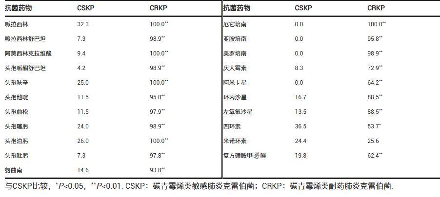 表1碳青霉烯類敏感和耐藥肺炎克雷伯菌對抗菌藥物的耐藥率比較