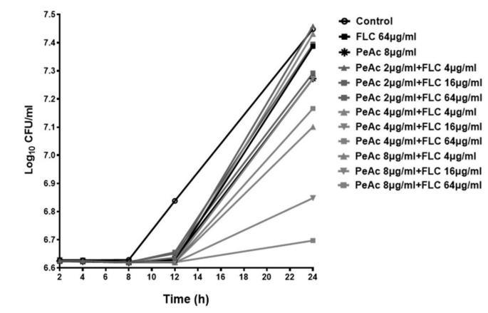 結果顯示,單用氟康唑(64μg/ml)或者單用PeAc(8μg/ml)8h后有顯示出一定的抑制白念珠菌生長的作用,12h后抑制作用則迅速減弱,白念珠菌生長情況與對照組接近。當固定PeAc濃度為2μg/ml時,與4、16、64μg/ml氟康唑合用,發現隨氟康唑濃度的升高,兩藥協同對耐藥菌的抑制作用也增加,但組內的抑制效果差異并不明顯。而隨著PeAc濃度的增加,兩藥合用的抑制耐藥菌生長的能力也逐漸加強,尤其是當PeAc濃度達到8μg/ml時,與4、16、64μg/ml氟康唑合用,發現兩藥合用抑制耐藥菌生長效果顯著,組內的抑制效果差異明顯,尤其是“PeAc 8μg/ml+FLC 64μg/ml”的組合使耐藥菌的生長抑制在較低水平。因此,兩藥合用協同抗真菌的作用與PeAc的量效關系更明顯。
