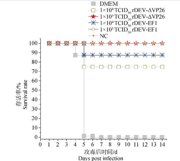 分別用兩種劑量(1×104 TCID50和1×105 TCID50)的rDEV-ΔVP26和對照毒株rDEV-EF1免疫鴨后14 d,用DEV強(qiáng)毒株對免疫鴨進(jìn)行攻毒,統(tǒng)計鴨的存活率。