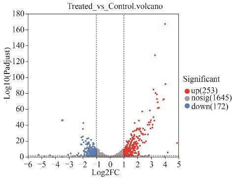 對(duì)樣本采用DESeq 2分析,篩選條件設(shè)為Padj<0.05且|Log 2(fold change)|≥1.5以獲得差異顯著表達(dá)基因。結(jié)果顯示共有425個(gè)差異表達(dá)基因,其中253個(gè)基因表達(dá)被滇黃精水提物干預(yù)上調(diào),172個(gè)基因表達(dá)被滇黃精水提物干預(yù)下調(diào)。說(shuō)明經(jīng)過(guò)滇黃精水提物處理的L.reuteri 1.2838許多基因在mRNA水平有差異表達(dá)(圖3)。