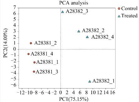 主成分分析(PCA)顯示,正常組和滇黃精水提物組呈現(xiàn)顯著分離,表示組間差異明顯。在PCA圖中,樣本點(diǎn)之間的聚集程度反映了樣本之間的相似性。如圖2所示,給藥組樣本點(diǎn)之間距離較近,說(shuō)明樣本之間的差異性較小,表明樣品制備合理可用于后續(xù)分析。