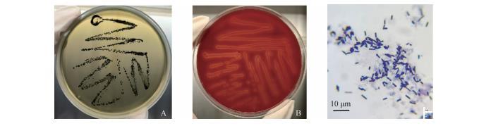 2.2.1 細菌分離鑒定分離菌株在RCM液體培養基中生長時出現渾濁并產生氣泡;在胰胨-亞硫酸鹽-環絲氨酸瓊脂(TSC)培養基上形成直徑2~5mm的外圍含有一圈白色暈圈的圓形黑色菌落(圖1A);在7%羊血瓊脂培養基上可形成表面光滑、顏色灰白、透明狀的圓形菌落(圖1B);鏡檢為革蘭陽性短桿菌(圖1C)。