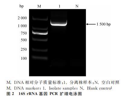 2.2.2 16S rRNA檢測16S rRNA基因PCR擴增產物大小約為1500bp(圖2),與預期長度一樣。