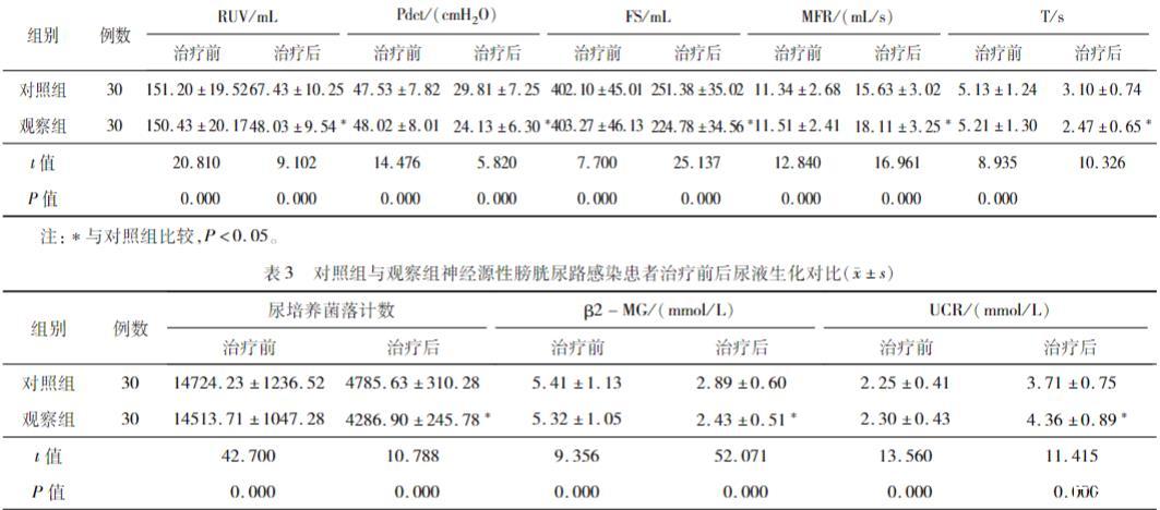 表2對照組與觀察組神經源性膀胱尿路感染患者治療前后尿流動力學對比(x±s)