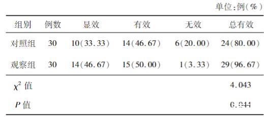 表1可見。對照組總有效率(80.00%),低于觀察組(96.67%),差異有統計學意義(P<0.05)。