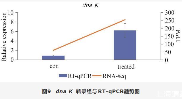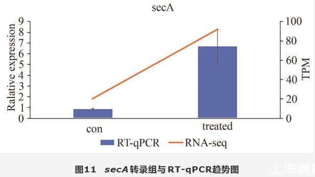 隨機選擇3個差異基因進行RT-qPCR驗證,其中secA與群體感應相關,ndk與生長相關。結果如圖9-圖11所示,驗證結果表明與對照組相比,給藥組的dna K、ndk、secA基因均上調,RT-qPCR的結果與測序結果一致,表明本研究轉錄組測序結果可信度較高。