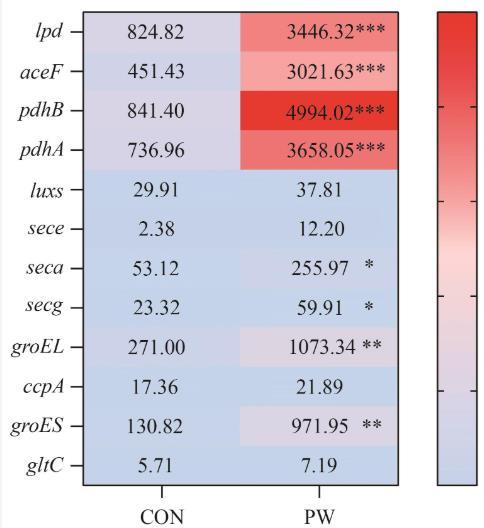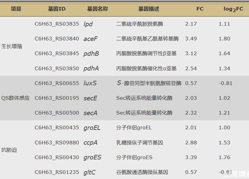 益生菌發揮益生作用,需要在環境中快速生長增殖成為優勢菌群,因此生長速度是益生特性的篩選條件之一。TCA循環通路中pdhA、pshB、dlat、dld上調,該通路和細菌最基本的生長狀態相關,能夠影響生物體能量代謝,在一定程度上解釋了L.reuteri 1.2838生長狀態的變化原因。