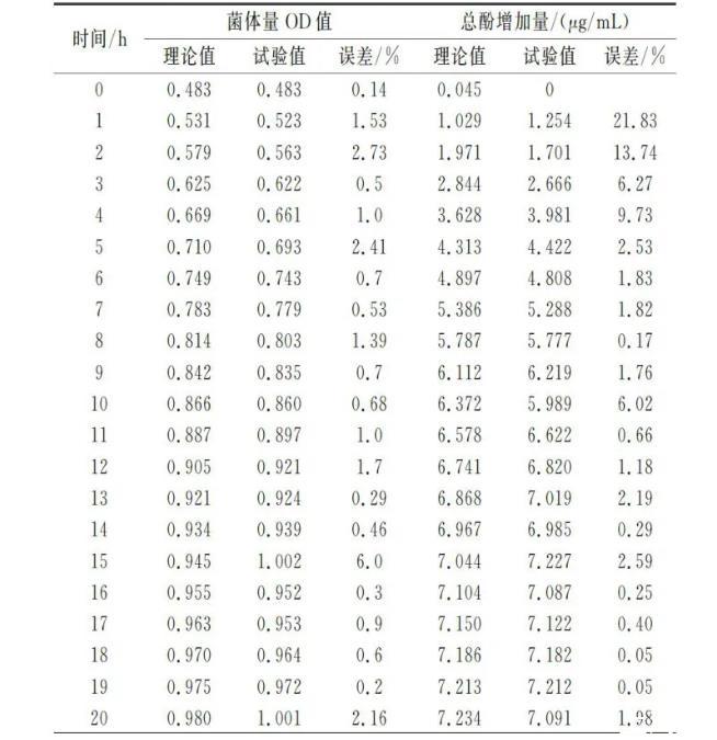 由表3可知,菌體生長模型和總酚增加量變化模型的理論值和試驗值之間的平均誤差僅為1.26%和3.77%,二者的平均誤差均小于5%,充分證明了模型的擬合度較高,能夠精準地描述紅棗汁發酵過程中物質的動態變化。