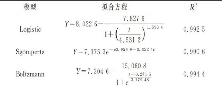 為了探究紅棗汁在植物乳桿菌發酵期間總酚含量的變化,利用Logistic、Sgompertz和Boltzmann模型對各時間點測得的總酚增加量進行非線性擬合,確定總酚含量變化的最佳動力學模型,3個模型擬合方程及其擬合系數R2見表1,總酚增加量用Y表示。
