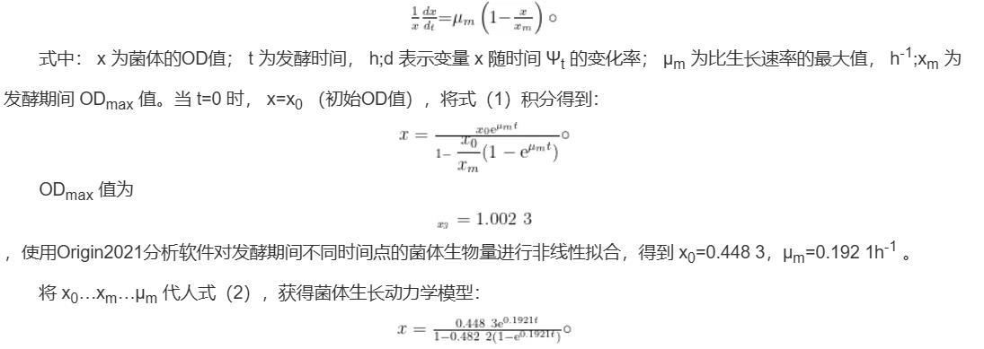 ODmax值為,使用Origin2021分析軟件對發酵期間不同時間點的菌體生物量進行非線性擬合,得到x0=0.448 3,μm=0.192 1h-1。