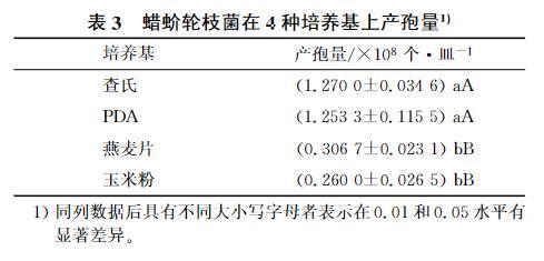 表3蠟蚧蚧輪枝菌在4種培養(yǎng)基上產(chǎn)孢量1)