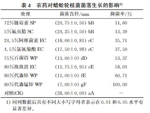 表4農(nóng)藥對蠟蚧蚧輪枝菌菌落生長的影響