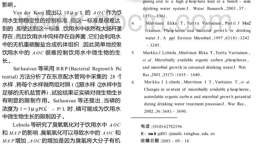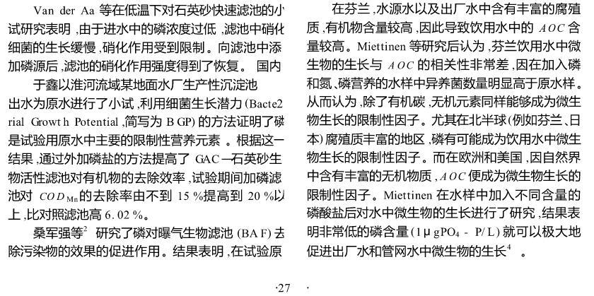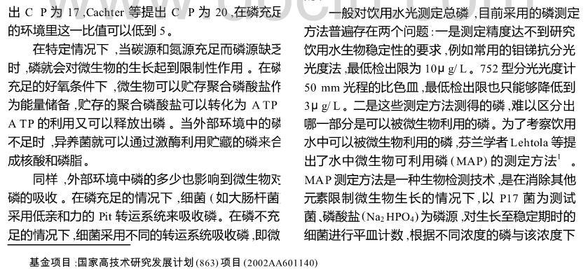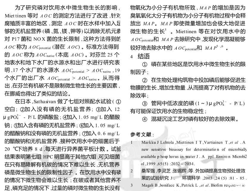 【摘要】:闡述了磷在微生物生長中的重要作用以及磷限制微生物生長的作用機理,介紹了飲用水中可以被微生物利用的磷源。著重從三個方面討論了磷對微生物生長限制作用的最新研究進展:外加磷源提高水處理構筑物的處理效率;磷對管網生物膜的影響;磷對飲用水生物穩定性的影響。