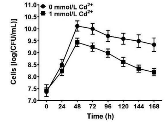 濃度為1mM。將不含Cd2+的培養(yǎng)液作為對照。培養(yǎng)物在30℃下以180轉/分鐘振蕩144小時,并測量菌落形成單位(CFU)以生成生長曲線。