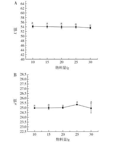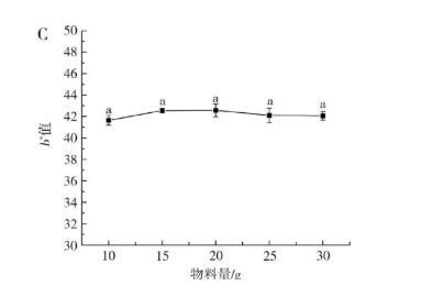 由圖6可知,沙棘果粉的L*值、a*值、?b*值隨著物料量的增加均無(wú)顯著性變化(Pgt;0.05),說(shuō)明10~30g物料量對(duì)沙棘果粉的色差沒(méi)有明顯影響。在相同微波能量和微波時(shí)間下,隨著物料量的增加,微波效能對(duì)沙棘果粉色差的作用不顯著。當(dāng)物料量為10,15,20,25,30g時(shí),ΔE分別為0.11,0.98,1.03,0.7,0.85。
