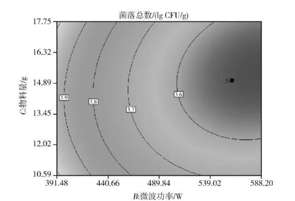 由表3可知,模型的一次項(xiàng)B、交互項(xiàng)AC的影響顯著(Plt;0.05);一次項(xiàng)c、交互項(xiàng)AB,BC的影響不顯著(Pgt;0.05);一次項(xiàng)A、二次項(xiàng)A2,B2,C2的影響極顯著(Plt;0.01。根據(jù)F值的大小判斷各因素對(duì)菌落總數(shù)的影響大小為微波時(shí)間gt;微波功率gt;物料量。