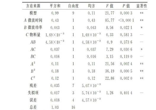 F檢驗(yàn)?zāi)芊从郴貧w模型的有效性,包括失擬項(xiàng)檢驗(yàn)和回歸方程顯著性檢驗(yàn)。由表3可知,模型的P=0.000 3lt;0.01,表明建立的模型極顯著,失擬項(xiàng)的P=0.401 4gt;0.05,表示失擬項(xiàng)不顯著,說(shuō)明所得多元二次回歸方程的擬合程度良好,具有顯著意義。