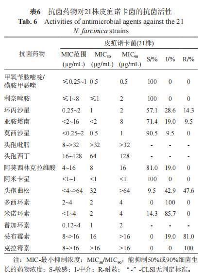 表6抗菌藥物對21株皮疽諾卡菌的抗菌活性