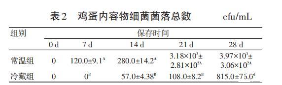 檢測結果雞蛋內容物菌落總數檢測結果見表2。由表2可知,保存前雞蛋內容物中沒有檢出細菌,隨存放時間的延長,常溫與冷藏條件下細菌總數均不斷增加,但差異明顯。常溫條件下保存7d的雞蛋內部已經有細菌滋生,14——21d菌落總數迅速增長,21d后菌落總數增幅仍較明顯。冷藏條件下保存7d雞蛋內容物未檢出細菌,保存14d、21d、28d雞蛋內容物細菌菌落總數均極顯著低于常溫保存組(P<0.01)。