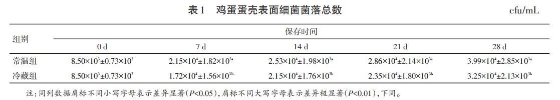 保存前隨機選取3個雞蛋,先采樣測定該批次雞蛋蛋殼表面細菌總數,然后用此3個雞蛋取樣測定蛋內容物細菌總數。保存雞蛋隨機分為2組,常溫組室溫保存,冷藏組存放于冰箱4℃冷藏室,每組各60個。分別于保存7、14、21和28d隨機取常溫組、冷藏組雞蛋各3個進行蛋殼與蛋內容物細菌總數培養測定,對比分析各組細菌生長繁殖規律與差異。