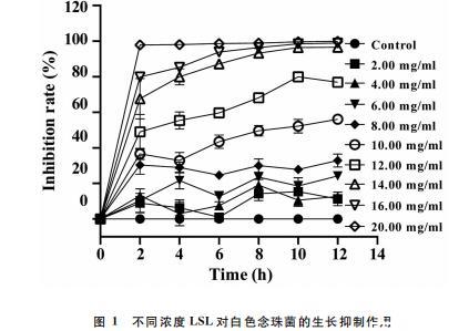 圖1為以12h為一生長周期繪制所得的LSL對白色念珠菌浮游細胞的時間-抑菌率變化曲線。可以發現,LSL對白色念珠菌浮游細胞的生長抑制效應快速且顯著,且抑制效果隨LSL濃度的增加而提升。其中,0~2h內的抑菌率增速最快,2h后8.00mg/mL的LSL即可發揮穩定的抑菌效果;當濃度高于8.00 mg/mL時,LSL還表現出明顯的殺菌和溶菌作用,此結果與LSL對白色念珠菌的MIC和MFC測定結果一致。