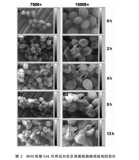 使用SEM觀察LSL處理不同時間后白色念珠菌細胞微觀結構的變化。處理組取培養好的對數生長期白色念珠菌菌液(菌濃已調整為1 x106CFU/mL),以2.0%(v/v)接種量將其接種到LSL濃度為MIC值的50mL液體培養基中,對照組取上述白色念珠菌菌液接種于等體積未添加LSL的液體培養基中。分別在培養2、4、8、12h時各取出3 mL培養物于6000r/min(離心半徑9.25cm)離心10 min收集菌泥,PBS溶液洗滌3次后使用2.5%戊二醛在4℃冰箱中固定12h,PBS溶液洗滌3次后離心并分別以乙醇梯度脫水(50%,70%,80%,90%,100%),真空條件下干燥,噴金,SEM觀察并拍照。